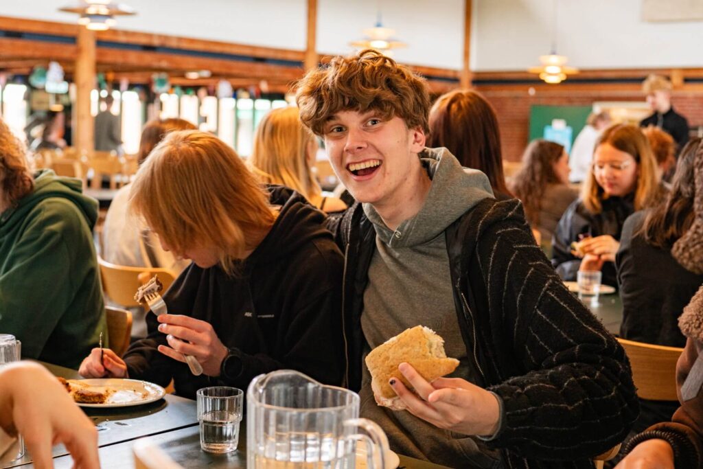 Der er elever i køkkenet om formiddagen, og desuden hjælper vi hinanden med at rydde op og gøre rent efter måltiderne.